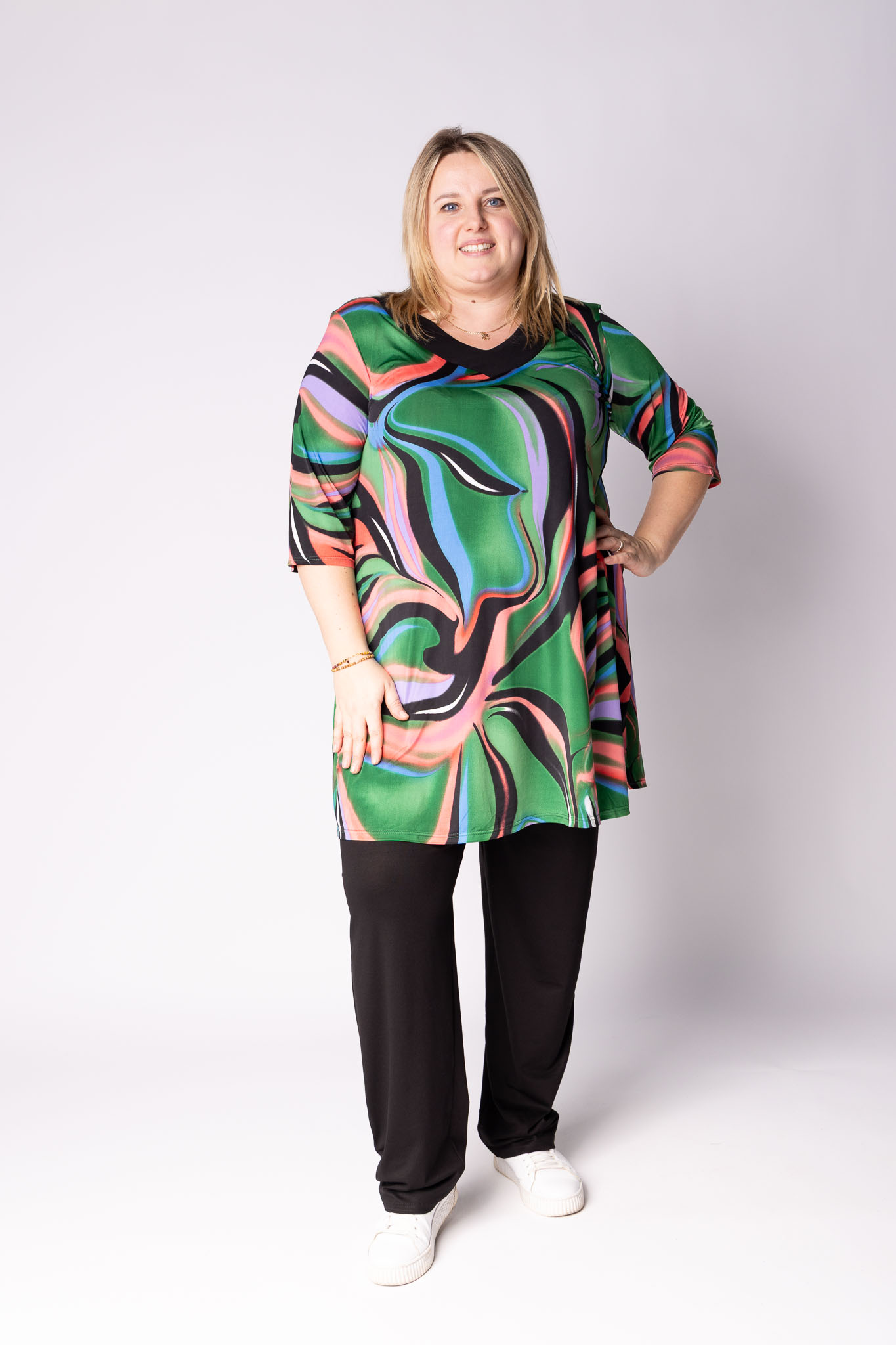 Tuniek Ans heeft een prachtige A-lijn pasvorm die soepel langs het lichaam valt en zorgt voor een flatterend, vrouwelijk silhouet. De licht uitlopende vorm geeft ruimte bij de heupen en buik, terwijl de bovenkant mooi aansluit – comfortabel én stijlvol tegelijk.